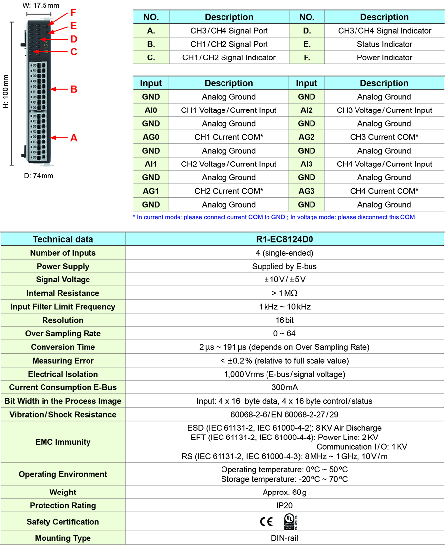 The R1-EC8124D0 4-channel analog input remote module controls analog signals for the EtherCAT master and must be attached to an R1-EC5500 E-bus remote power coupler on the EtherCAT network for remote control.